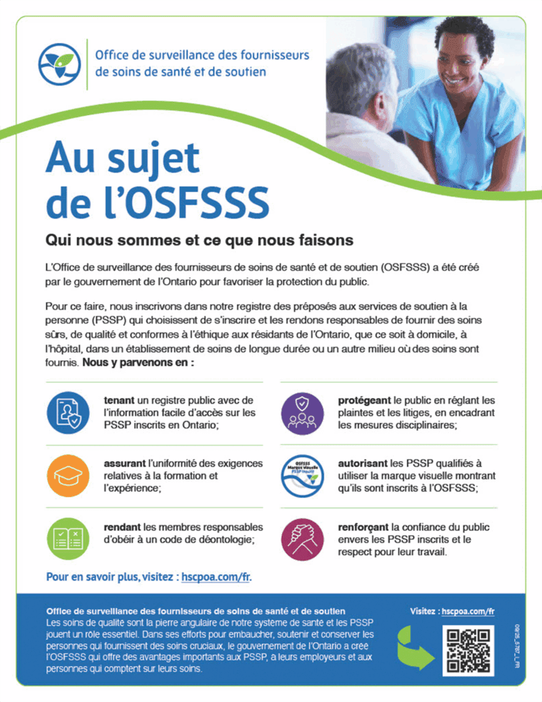 Grâce à des activités de sensibilisation et de formation, les partenaires du système de santé de l’Ontario, les PSSP, les employeurs de PSSP et leurs formateurs, de même que le public, sauront à quoi s’attendre.