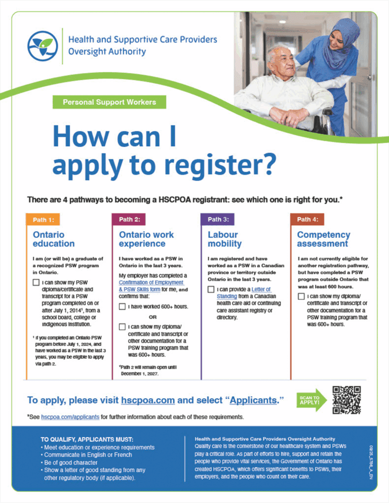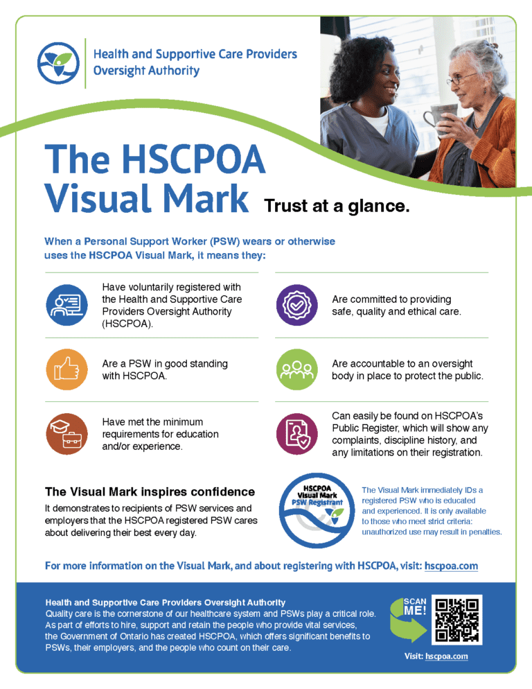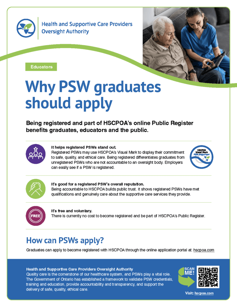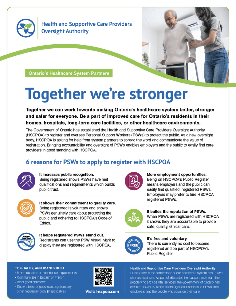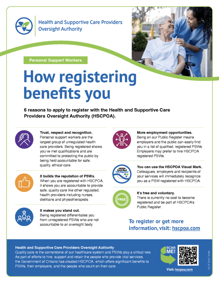 HSCPOA began registering Personal Support Workers (PSWs) on December 1, 2024. Registration is voluntary.