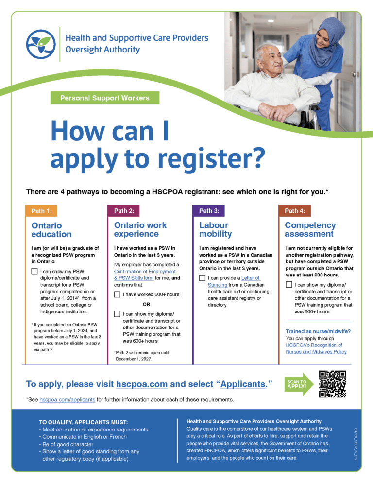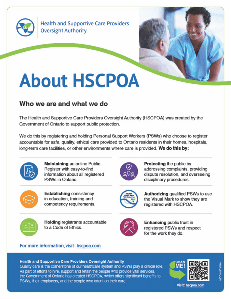HSCPOA began registering Personal Support Workers (PSWs) on December 1, 2024. Registration is voluntary.